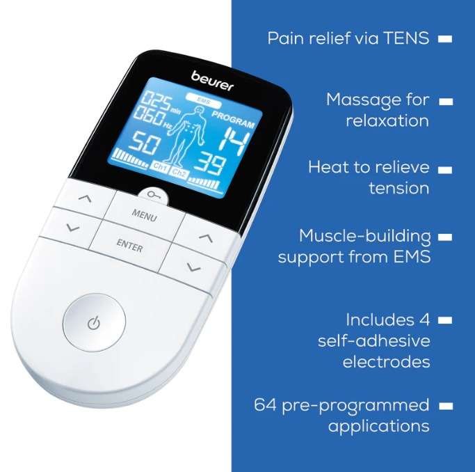 يأتي جهاز Beurer EMS/TENS مزودًا بتقنية TENS لمساعدتك على تخفيف الألم، ويوفر تقنية EMS لدعم روتين تدريب عضلاتك، ويوفر لك استرخاءً مريحًا. يحتوي جهاز EM 49 على 64 تطبيقًا مبرمجًا مسبقًا، بالإضافة إلى 6 برامج قابلة للتخصيص، حيث يمكنك ضبط التردد، وعرض النبضة، ووقت التشغيل/الإيقاف بما يتناسب مع احتياجاتك الخاصة.
