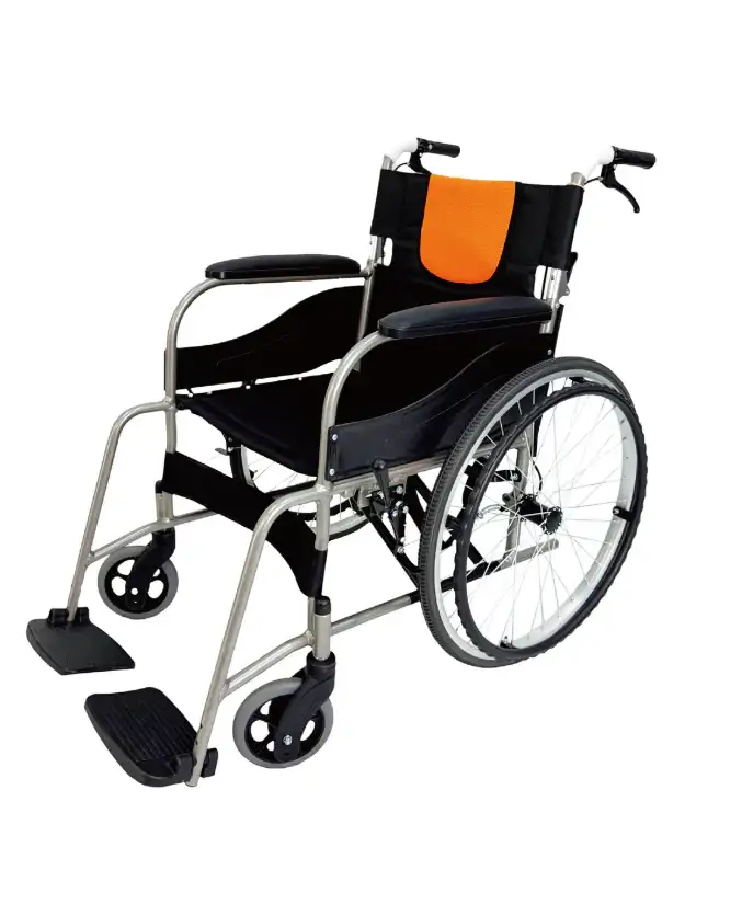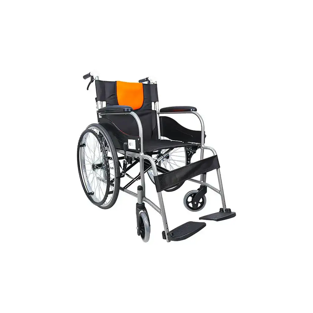 كرسي متحرك طبي عالي الجودة مصمم لمنح المستخدم راحة وأمانًا أثناء الحركة اليومية. يتميز الكرسي بمسند ظهر مبطن بلون برتقالي يمنح دعمًا إضافيًا، مع مقعد قماشي قوي يسهل تنظيفه.