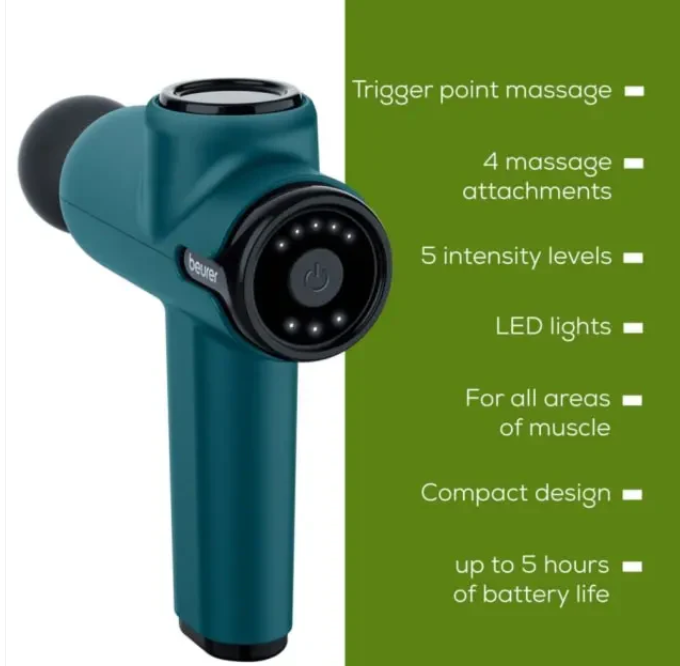 مسدس التدليك الأنيق من بيورر يُسهّل استخدام التدليك ويخفف التوتر. يتميز جهاز MG 99 بتصميمه المريح الذي يُسهّل استخدامه. يزن 620 غرامًا فقط، ما يُتيح لك اصطحاب مسدس التدليك الصغير معك أينما ذهبت.