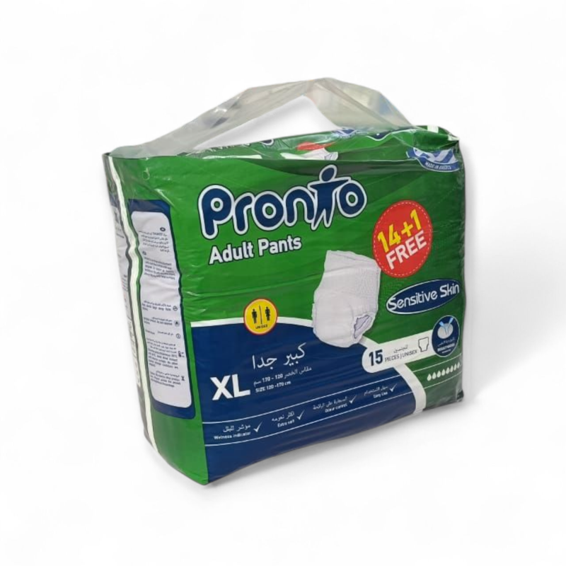حفاضات برونتو هي الخيار الأمثل لمن يبحثون عن حل فعال وسري لمشكلة سلس البول المتوسط إلى الشديد. يتميز هذا المنتج بالجودة العالية لكونه صنع في اليونان، ويأتي بعبوة اقتصادية تحتوي على 15 قطعة (14 قطعة أساسية + 1 قطعة مجانية).