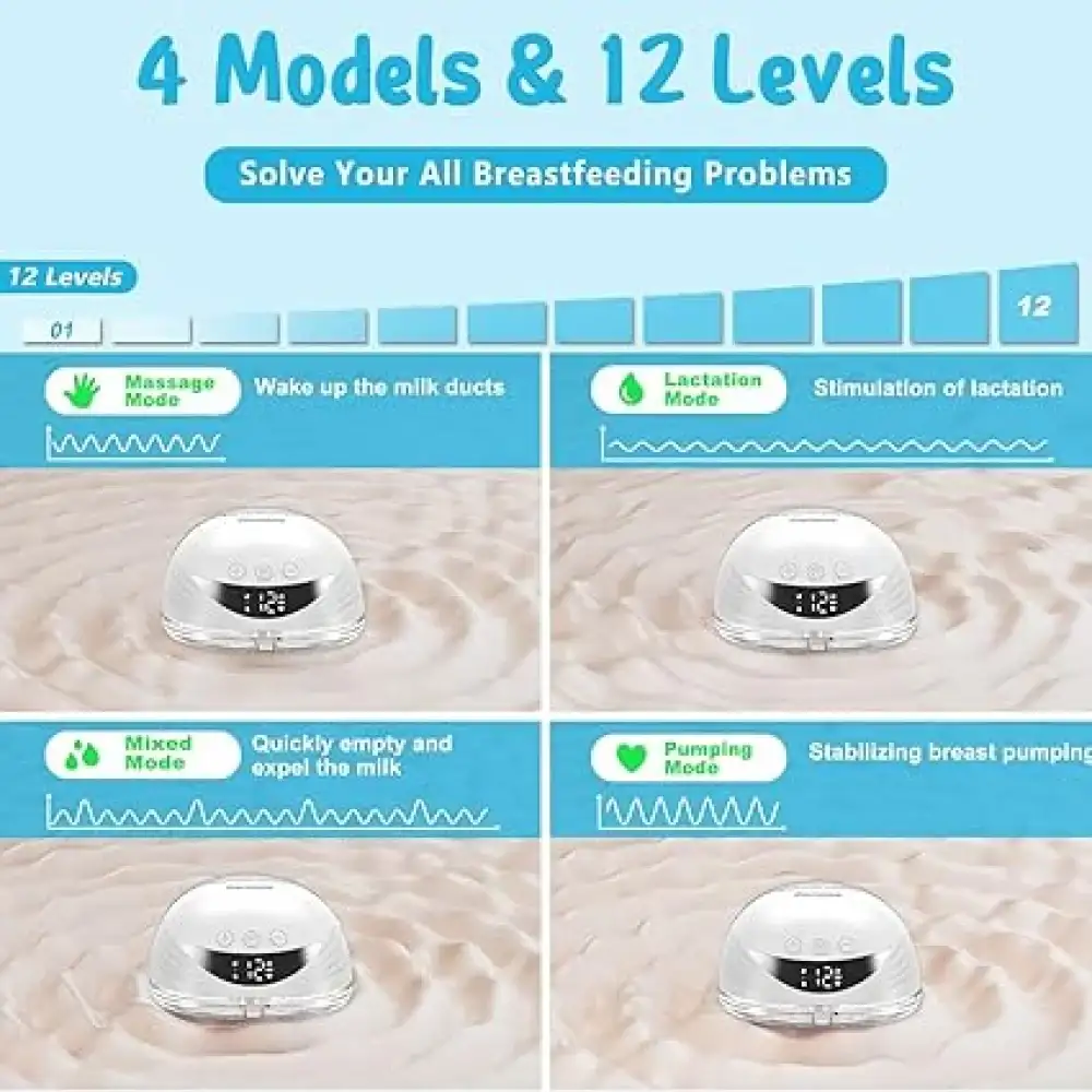 • شفط قوي من 12 مستوى: تحتوي مضخة الثدي اللاسلكية على مضخة شفط قوية. يمكن أن تصل قوة الشفط القصوى إلى 290 ملم زئبق. يحتوي على 4 أوضاع عمل، كل وضع مع 12 مستوى شفط لتختار من بينها. المزيد من المستويات، هناك دائمًا مستوى واحد لك. لذلك يمكنك اختيار مستوى احتياجاتك لرحلة الرضاعة الطبيعية المريحة.