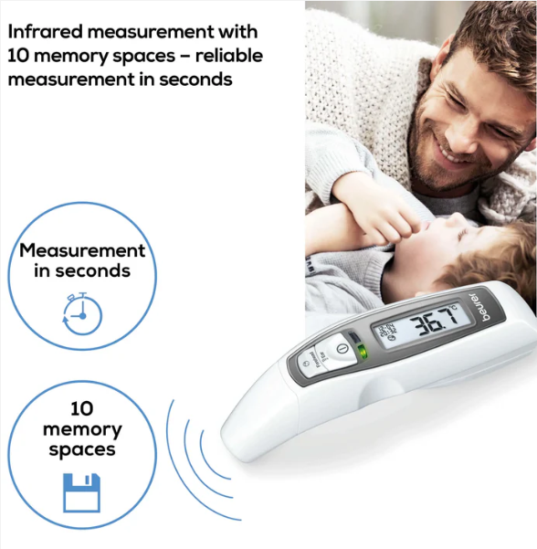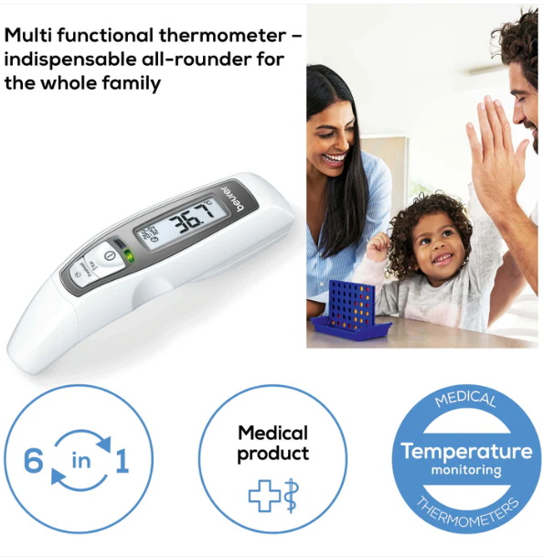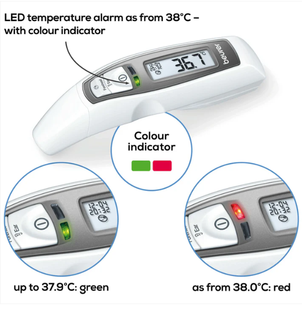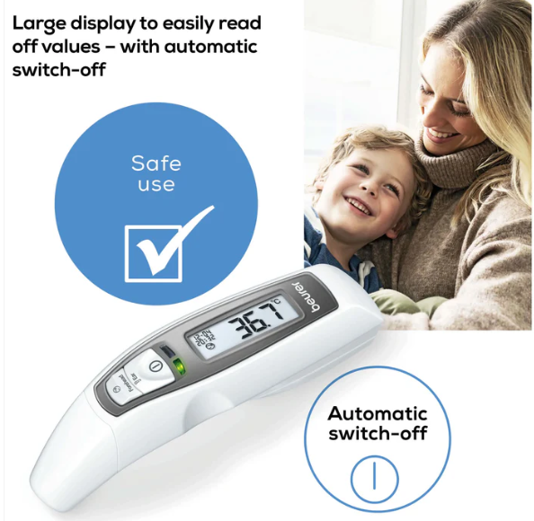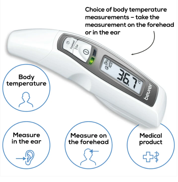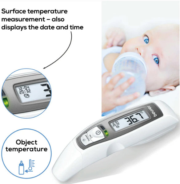 جهاز متعدد الاستخدامات! بالإضافة إلى قياس درجة حرارة الأذن والجبهة، يُمكن لمقياس الحرارة أيضًا تحديد درجة حرارة الأسطح. يُعدّ منبه درجة الحرارة وعرض التاريخ والوقت إضافات مثالية لضمان قياس سهل ومريح.