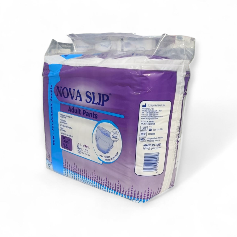 حفاضات NOVA SLIP Pants هي خيار متميز وموثوق لتوفير أعلى مستويات العناية والحماية للأشخاص الذين يعانون من سلس البول. تم تصميمها بشكل خاص لـ "الأفراد النشطين والمتحركين" (For dynamic people)، حيث توفر سهولة الاستخدام المطلقة بفضل تصميمها الشبيه بالملابس الداخلية (البانتس)، مما يحافظ على الخصوصية وحرية الحركة.