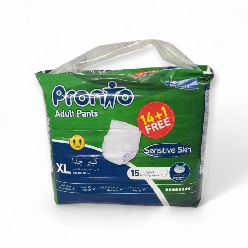 حفاضات برونتو هي الخيار الأمثل لمن يبحثون عن حل فعال وسري لمشكلة سلس البول المتوسط إلى الشديد. يتميز هذا المنتج بالجودة العالية لكونه صنع في اليونان، ويأتي بعبوة اقتصادية تحتوي على 15 قطعة (14 قطعة أساسية + 1 قطعة مجانية).