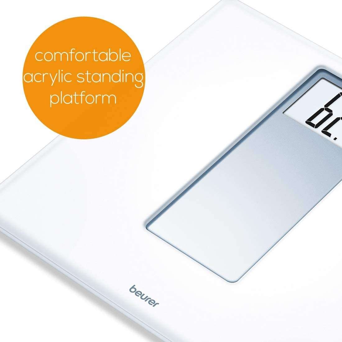 ميزان الحمام الشخصي مُبهرٌ بجزءه الزجاجي الأنيق الذي يُضفي لمسةً مميزةً عليه. شاشة LCD الكبيرة تُسهّل عملية الوزن.