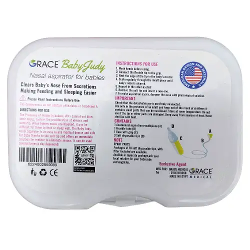 شفاط الأنف للأطفال Grace Baby Judy يساعد على تنظيف أنف الطفل بلطف وسهولة، مما يساهم في تحسين التنفس خاصة أثناء نزلات البرد أو انسداد الأنف.