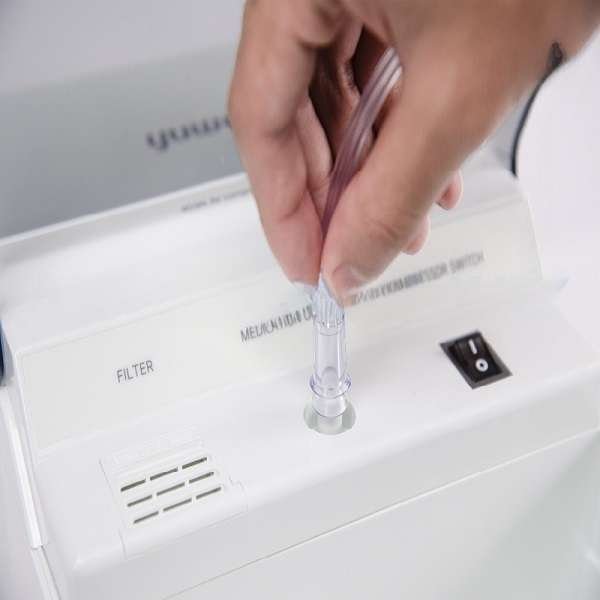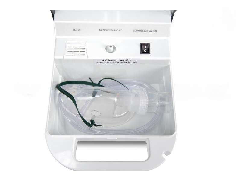 - مبدأ العمل: يقوم الجهاز بضغط الهواء عبر أنبوب إلى كوب الدواء، مما يحول الدواء السائل إلى جزيئات رذاذ دقيقة يتم استنشاقها عبر قناع الوجه أو قطعة الفم.