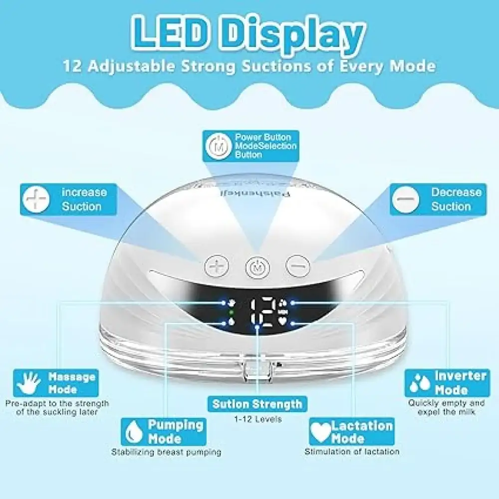• شفط قوي من 12 مستوى: تحتوي مضخة الثدي اللاسلكية على مضخة شفط قوية. يمكن أن تصل قوة الشفط القصوى إلى 290 ملم زئبق. يحتوي على 4 أوضاع عمل، كل وضع مع 12 مستوى شفط لتختار من بينها. المزيد من المستويات، هناك دائمًا مستوى واحد لك. لذلك يمكنك اختيار مستوى احتياجاتك لرحلة الرضاعة الطبيعية المريحة.